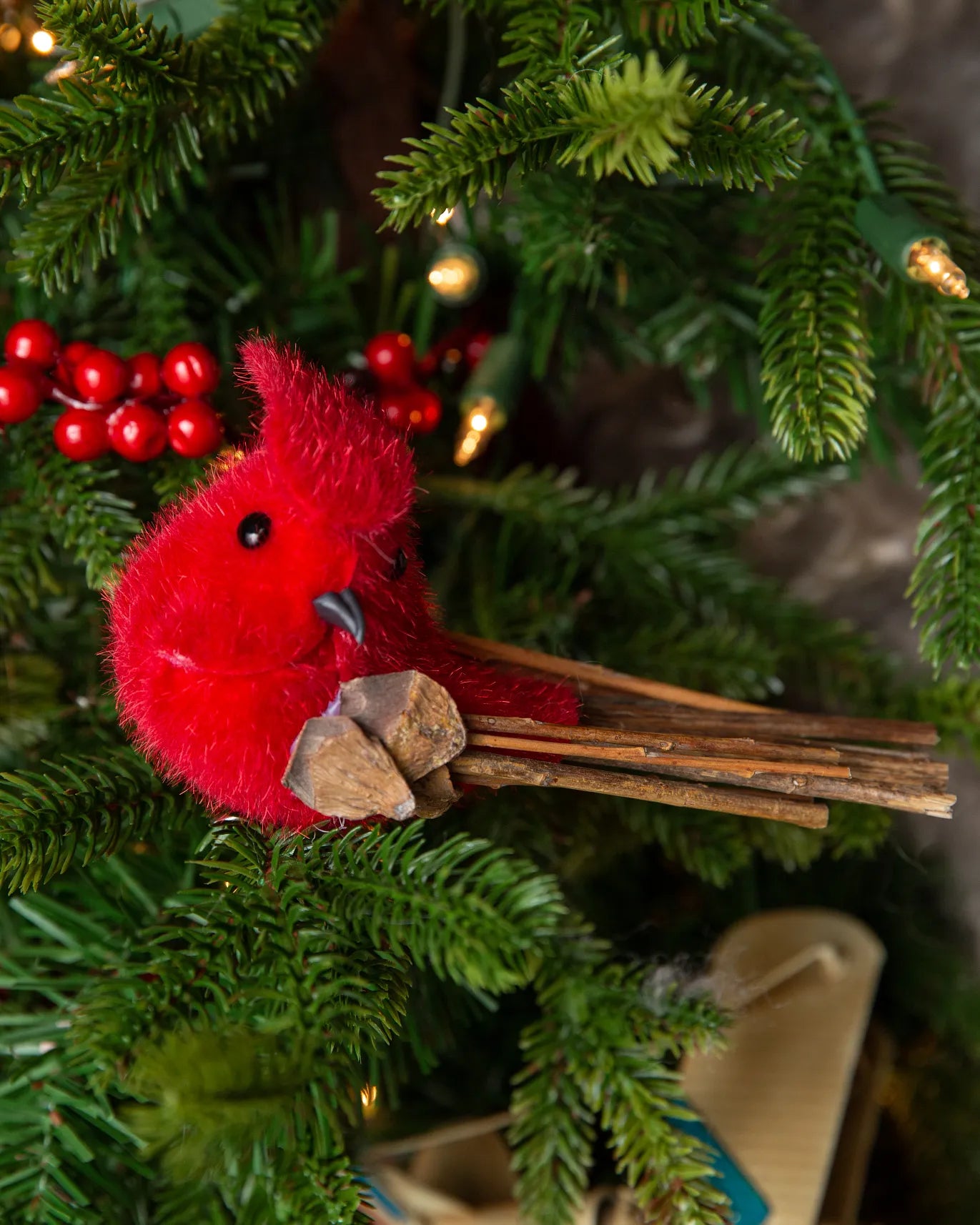 - Designed with a natural wool beard, faux fur trim, dried pine tree trunk, and natural pinecones