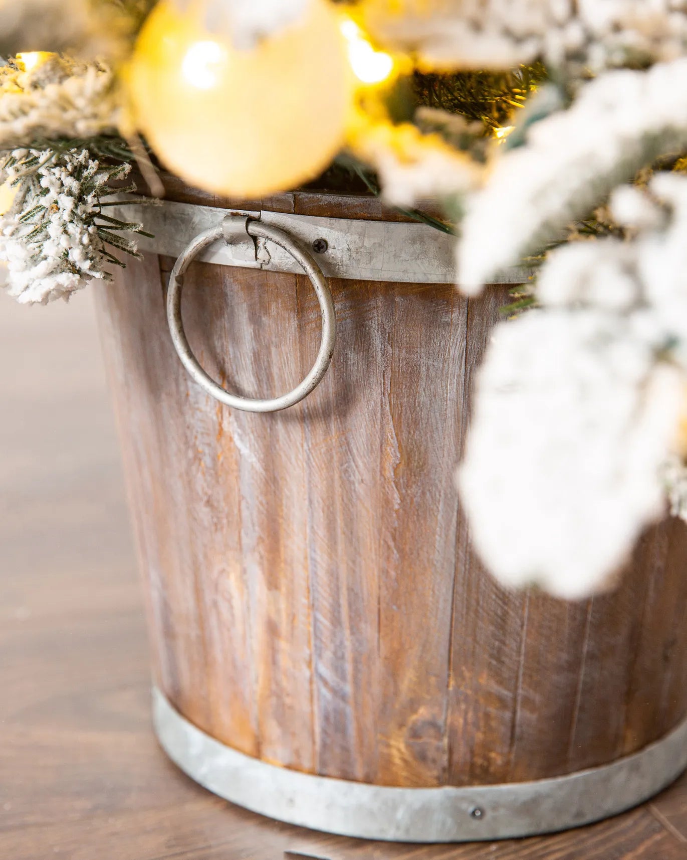 Snow-covered branches and ornaments capture the beauty of winter. Hand-strung with color-changing lights, this potted Christmas tree beams peacefully with the glow of clear lights and takes on a festive air with multicolored lights. A wooden bucket base lends a nice rustic touch and allows for easy display anywhere around your home.